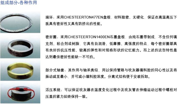 应用设备:锅炉吹灰器的密封,IK-525、545型长伸缩吹灰器适用于吹灰器厂家:戴蒙得(DIAMOND POWER)、贝尔格曼(BERGEMANN)及其他国产吹灰器。
