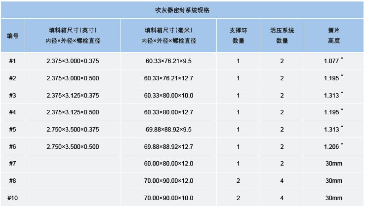 应用设备:锅炉吹灰器的密封,IK-525、545型长伸缩吹灰器适用于吹灰器厂家:戴蒙得(DIAMOND POWER)、贝尔格曼(BERGEMANN)及其他国产吹灰器。